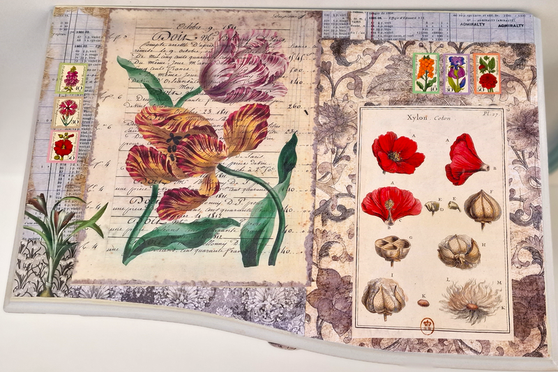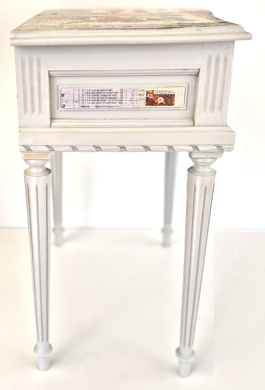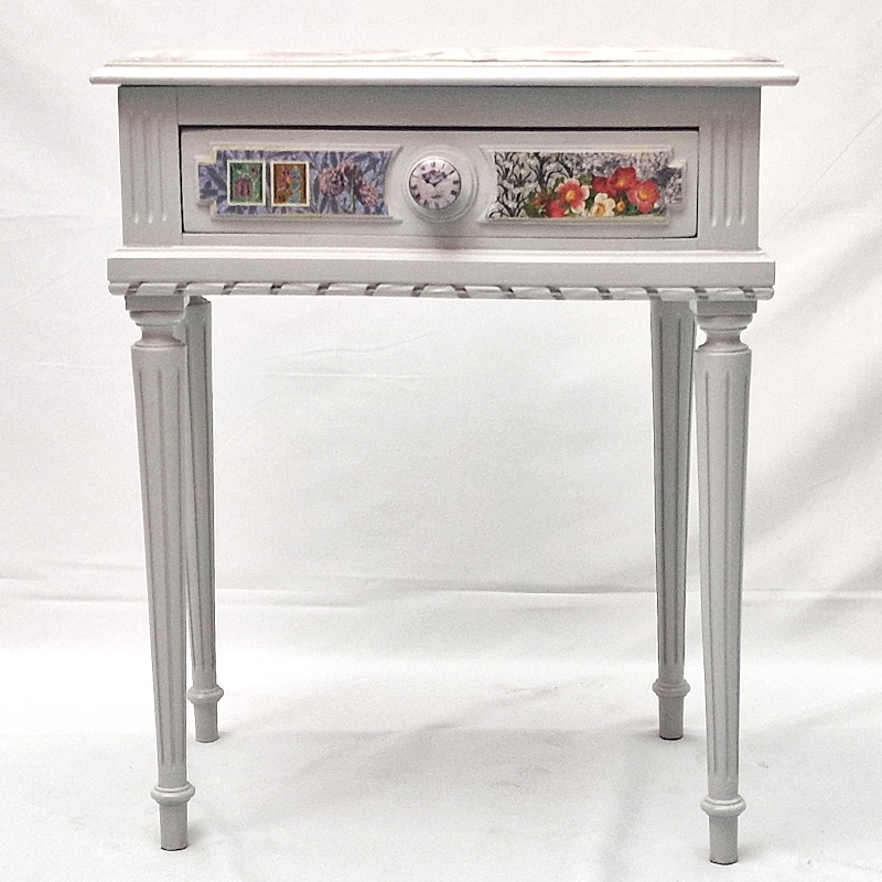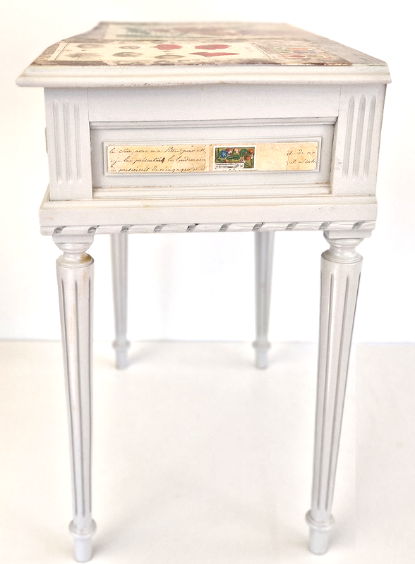 UNIKAT! Chippendale Nachttischchen mit gedrechselten Beinen, einer Schublade und Porzellanknopf mit Zifferblatt (10 nach 10). Das filigrane Möbelstück erhielt eine Gestaltung mit Schriftpapieren, grau grundigen Musterpapieren, Blumenabbildungen und Originalbriefmarken mit Blumen. VERSAND MÖGLICH.