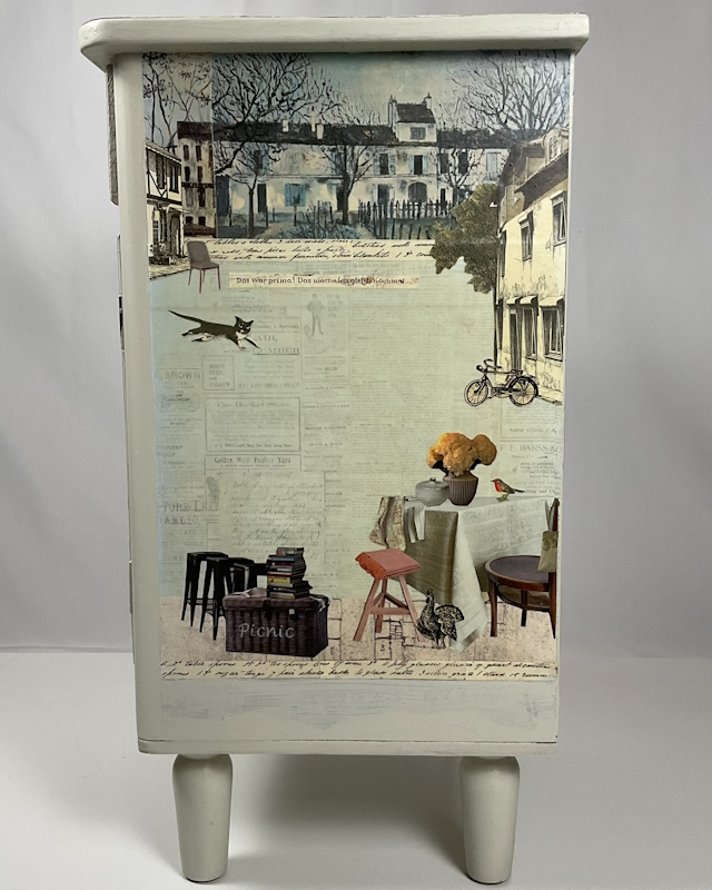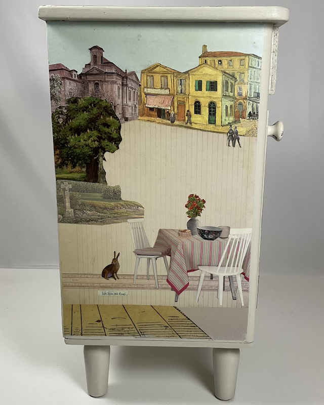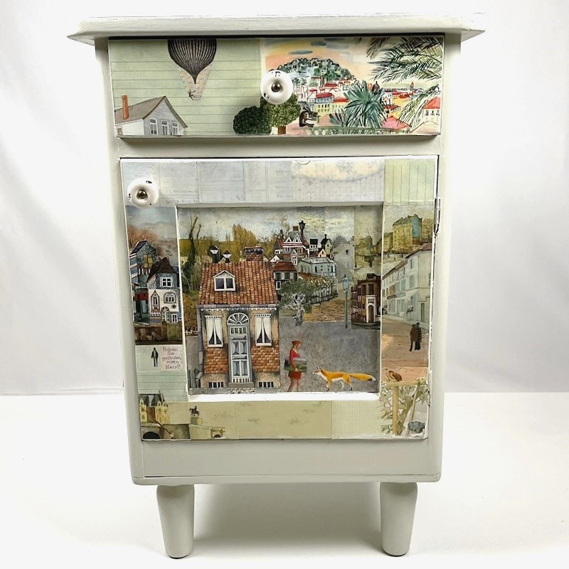 UNIKAT! Kleiner Nachttisch mit gedrechselten Beinen und einer Gestaltung aus Kinderbuchmotiven und Häusern aus Kunstdrucken. VERSAND MGÖLICH.