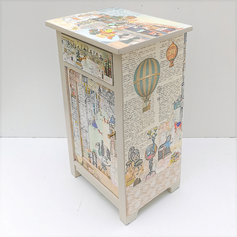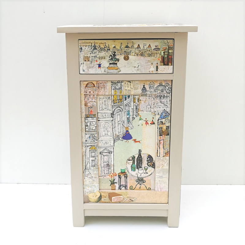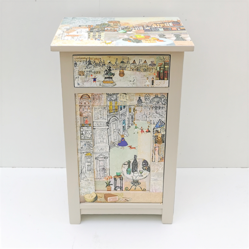 UNIKAT! Hoh, alte Kommode mit einer Schublade, einer Tür und geriffelten Porzellanknöpfen. Die Bildkommode zeigt Marktplätze mit Gastronomie in einer kleinen Stadt. Bis auf einige Kinder ist die Stadt nahezu menschenleer. Die Kinder sind verkleidet und freuen sich auf das bevorstehende Gauklerfest. Basis der Gestaltung der Häuserzeilen sind Zeichnungen aus einem Kinderbuch der 60er Jahre und Ausschnitte aus Parisbildern von Utrillo. Die Kinder stammen ebenfalls aus einem Kinderbuch. Auf den Seitenflächen kommt ein Schriftpapier und Heißluftballons zum Einsatz. VERSAND MÖGLICH.