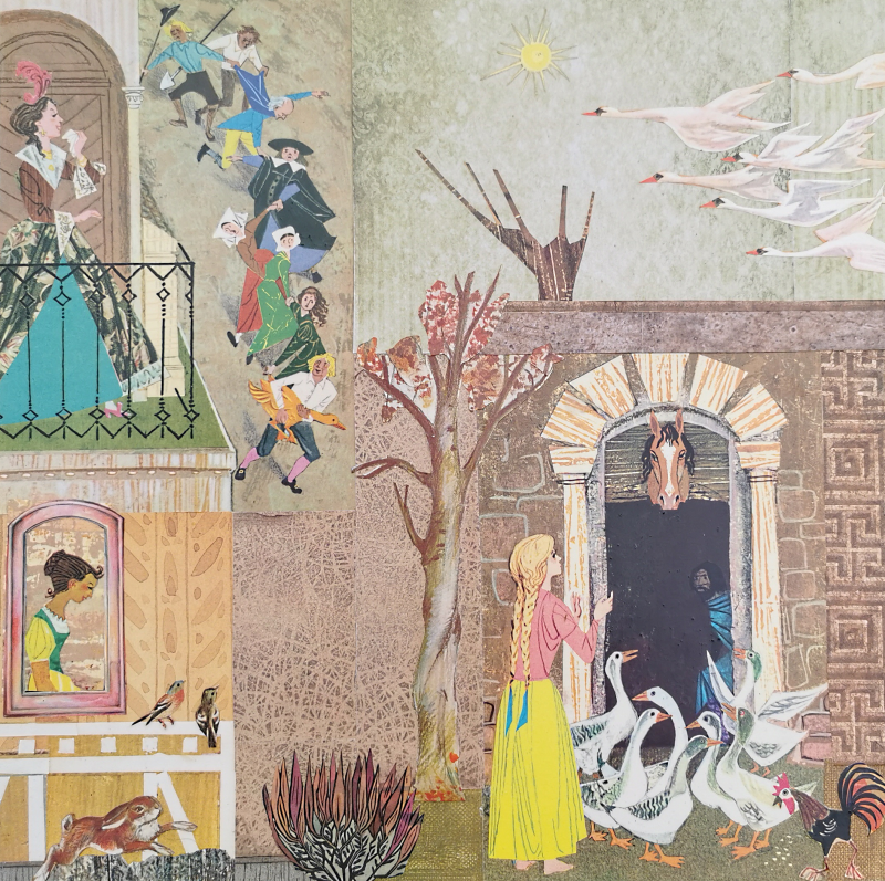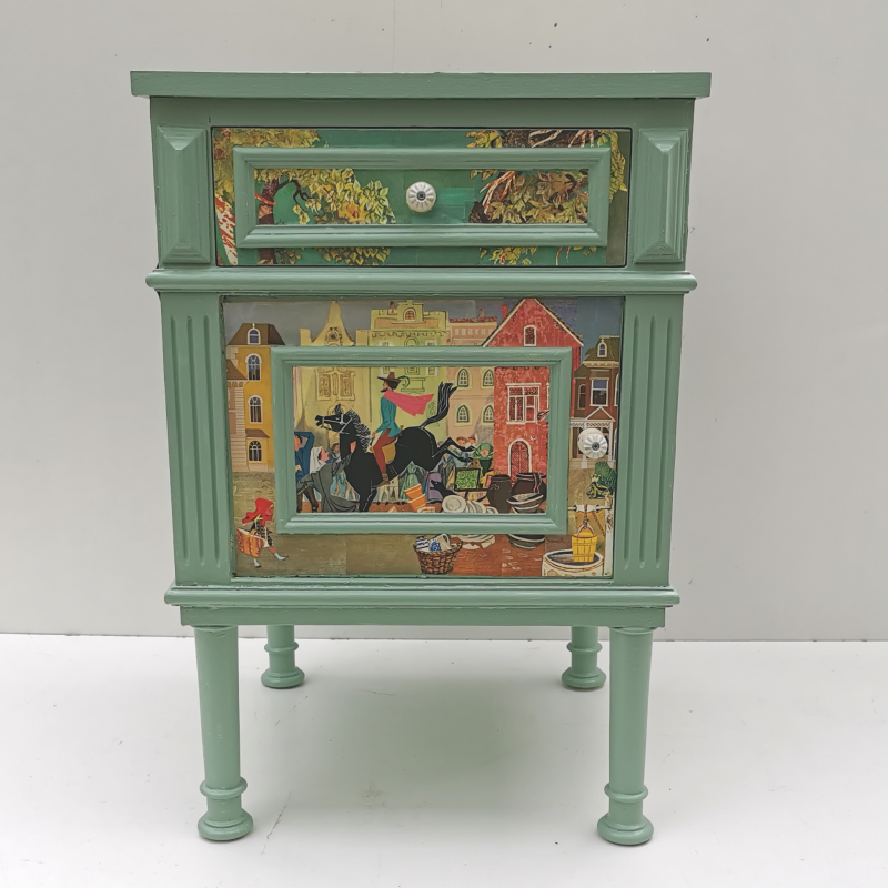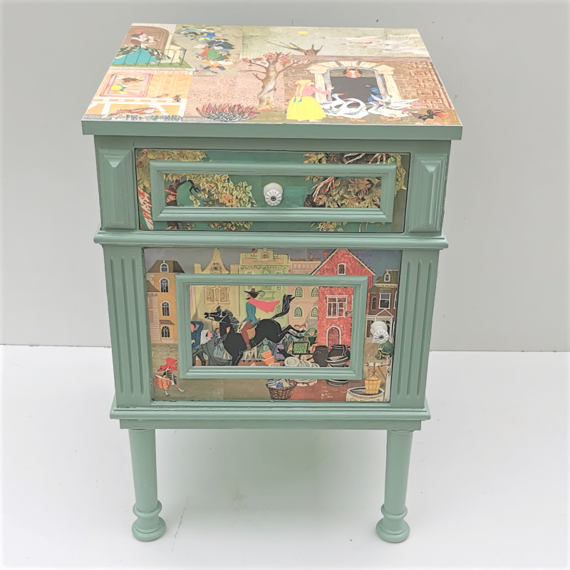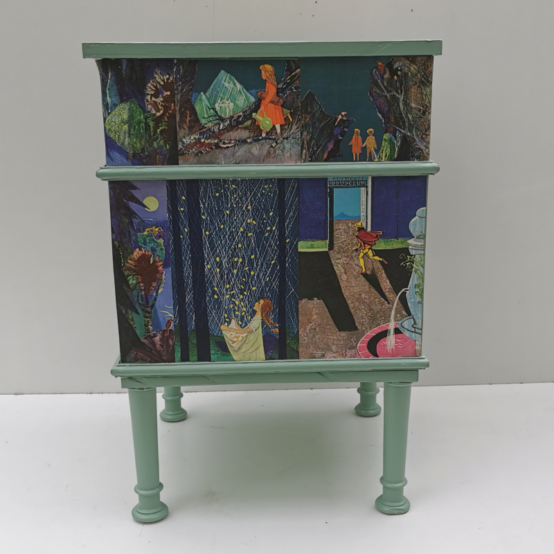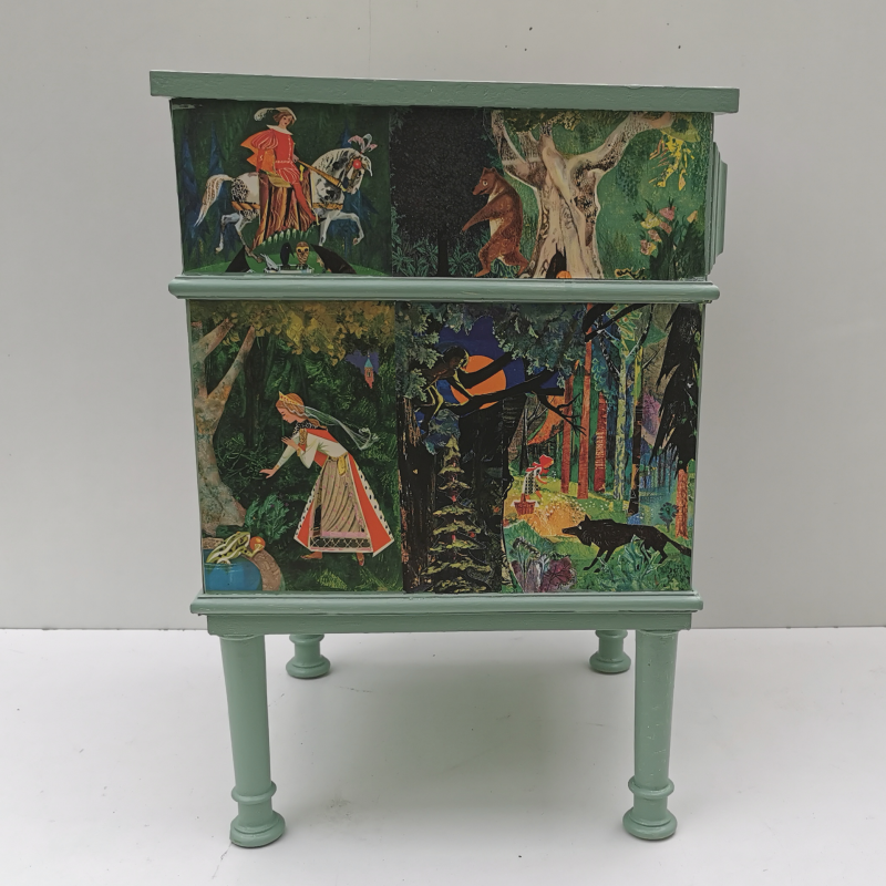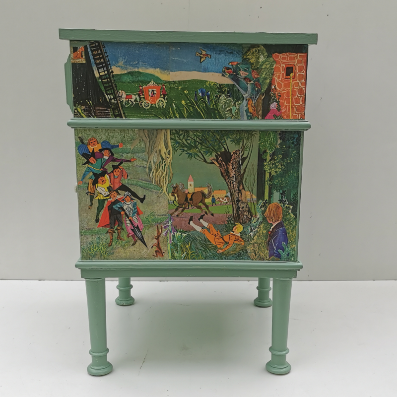 UNIKAT! Niedrige alte Kommode mit gedrechselten Beinen, einer Schublade, einer Tür und geriffelten Porzellangriffen. Darstellungen aus einem Märchenbuch aus den 60er Jahren werden miteinander verbunden. Die Bildgestaltung erfolgt auf Front, Seitenflächen, Rückseite und Deckplatte. Die Kommode kann somit auch frei im Raum stehen. Wegen des Alters und der Form der Kommode ist eine Nutzung im Kinderzimmer nicht zu empfehlen. VERSAND MÖGLICH.