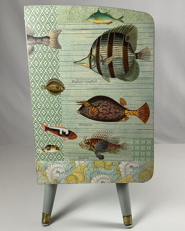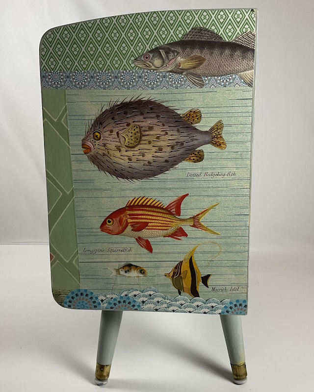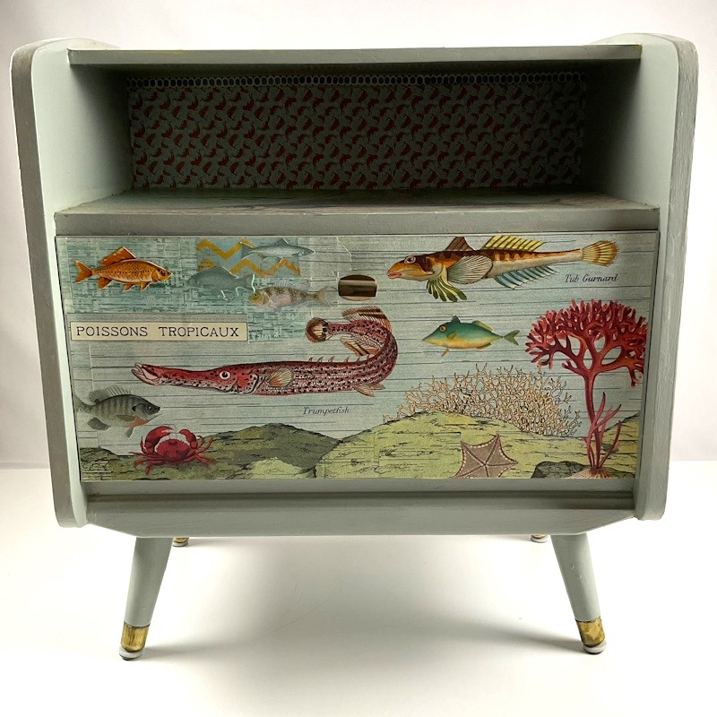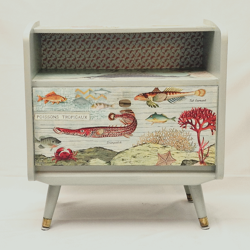 UNIKAT! Kleine Kommode auf hohen Beinen mit einem offenen Fach und einer Klappe mit Metallknopf. Die leichtfüßige Kommode ist mit Ausschnitten aus einem französischen Geschenkpapier mit Tropenfischen, Musterpapieren und Fischabbildungen gestaltet. Auf der Deckplatte gelingt es einem Fischscharm aus einer Konservendose zu entkommen. VERSAND MÖGLICH.