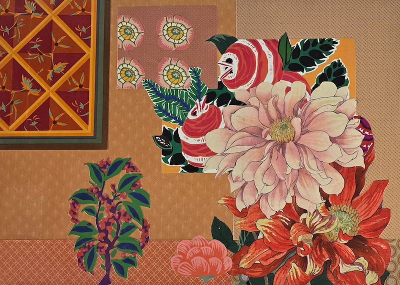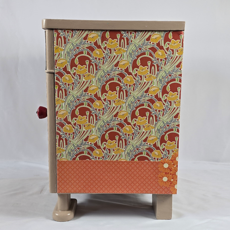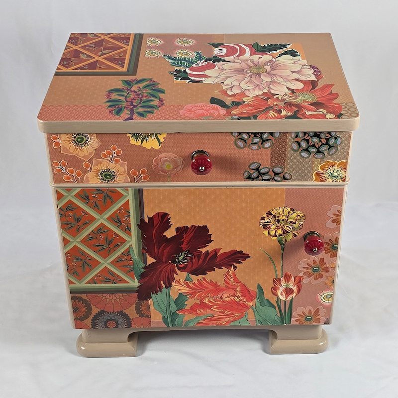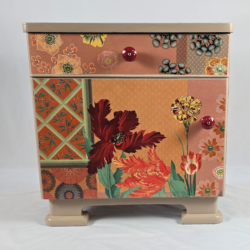 UNIKAT! Die Gestaltung dieser Kommode mit einer Schublade, einer Tür und roten Porzellangriffen besteht aus einer Kombination aus Musterpapieren und Blütenabbildungen. Einige Art Deco Motive vervollständigen die üppigen Blüten von Tulpen und Magnolien. VERSAND MÖGLICH.