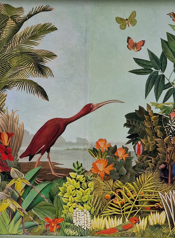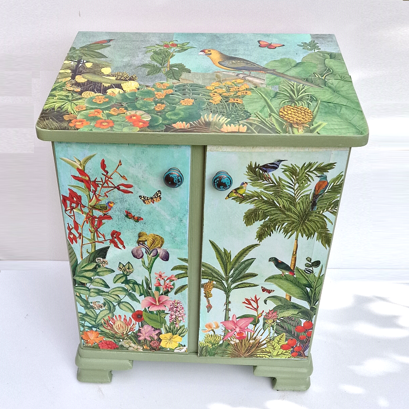 UNIKAT! Doppeltürige Kommode mit geschwungenen Beinen. Auf grün pastellfarbigen Hintergrundpapieren sind Pflanzencollagen zum Thema Dschungel angeordnet. Papageien und Schmetterlinge vervollständigen die Landschaftsbilder. Der Schrank ist auch für ein Kinderzimmer geeignet. Bitte nachfragen, ob eine Anlieferung möglich ist. Kein Versand!