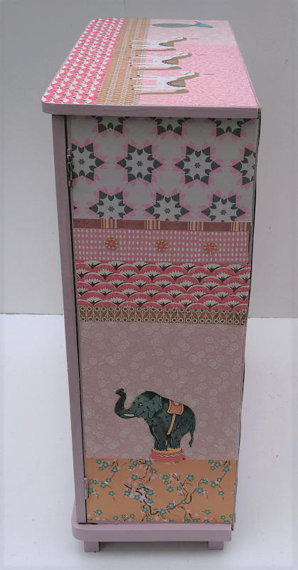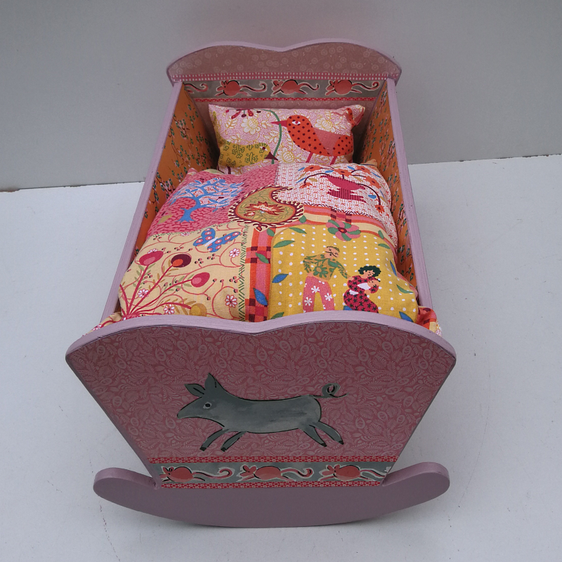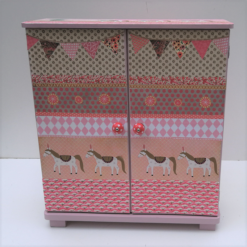 UNIKAT! Großer Puppenschrank mit Kleiderstange, vier Regalbrettern und Porzellanknöpfen. Die Gestaltung besteht aus Musterpapieren in Rosa, Gelb und Rot, die auf den Türen die Parade von vier Zirkuspferdchen rahmen. Auf den Seiten: Musterpapiere um zwei flache Pappspielfiguren mit Zirkusmotiven aus den 60er Jahren. (Auf der Rückseite: Tapete aus den 60er Jahren.) Auf der Deckplatte laufen drei Pferdchen im Freien herum. Auf einem stilisierter Baum sitzt ein Vogel. Zu diesem Puppenschrank passt farblich die Puppenwiege "Tapeten-Eselchen" (75 €), Komplettpreis Puppenschrank und Wiege 190 €. VERSAND MÖGLICH.